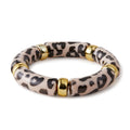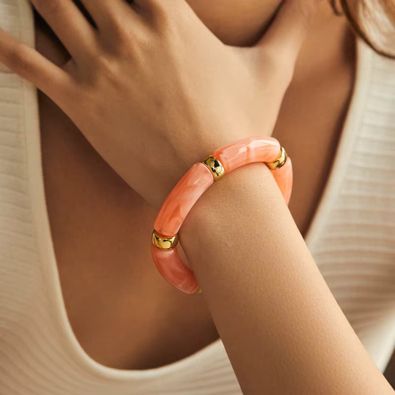 Stretchy chunky Bohemian bracelet, colorful resin tube beads and gold spacers, designed for easy stacking and comfortable elastic-fit wear.