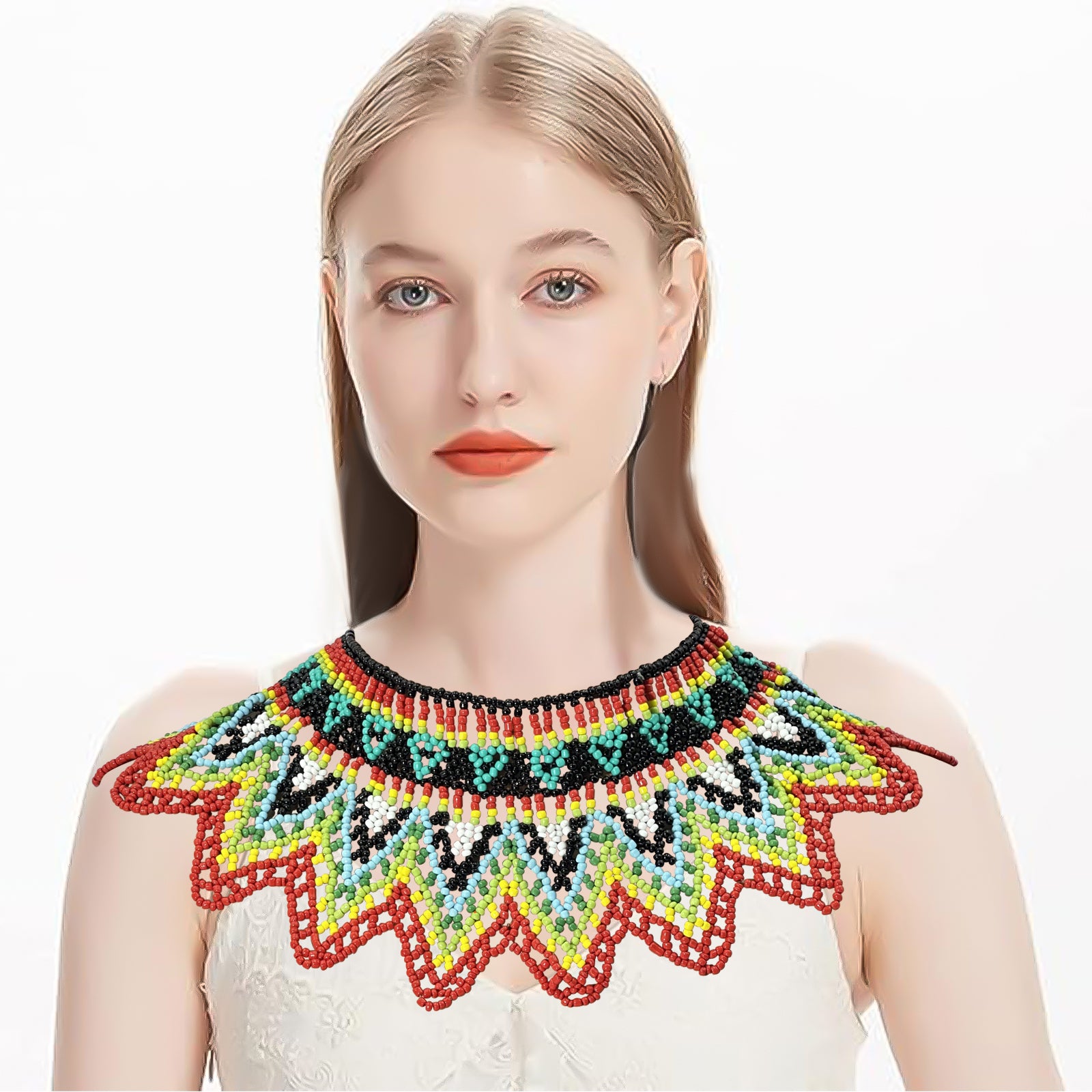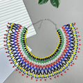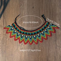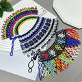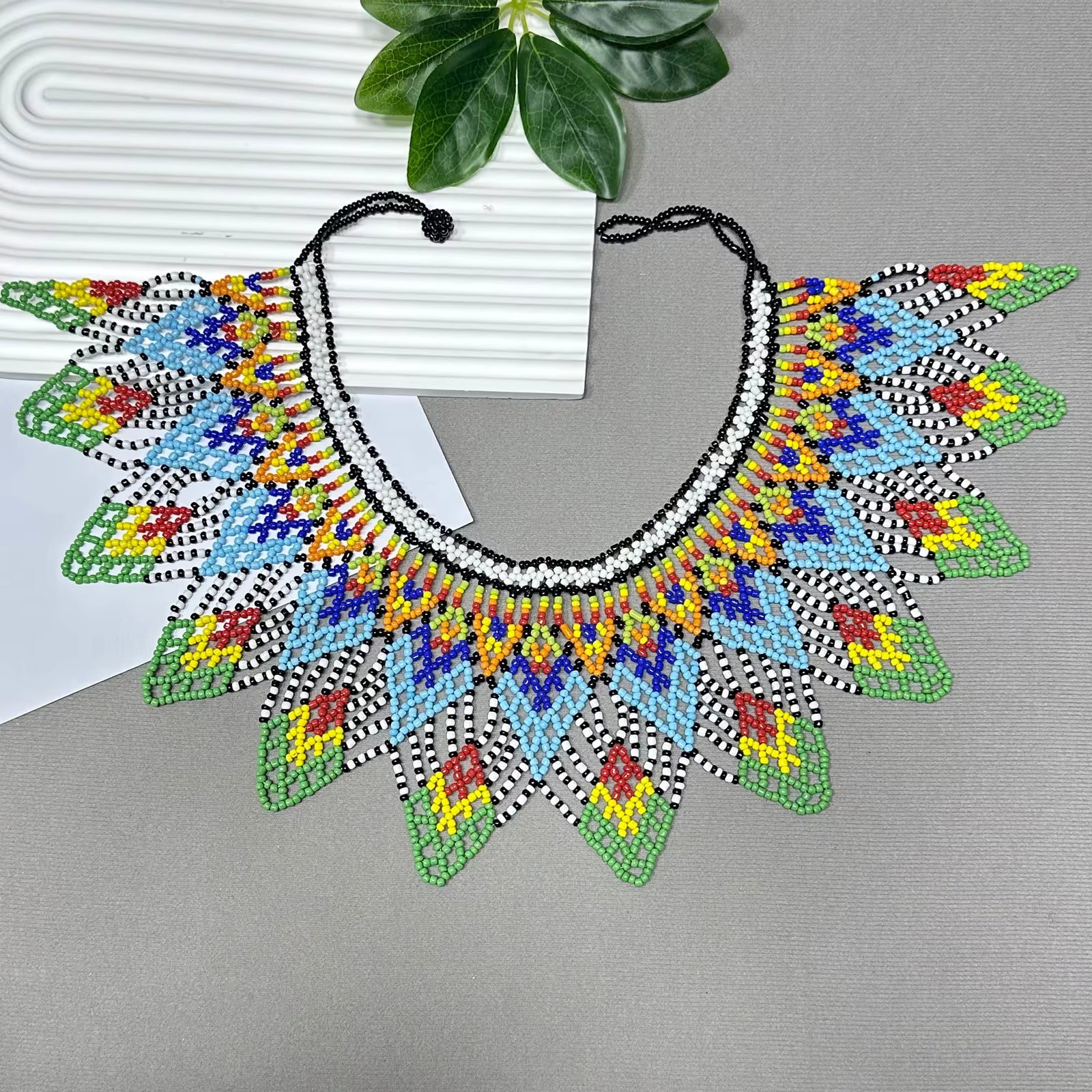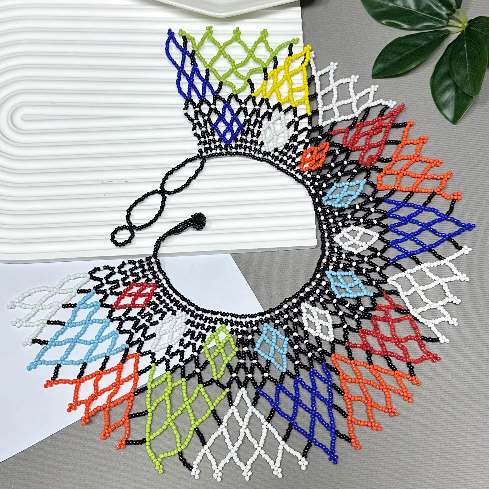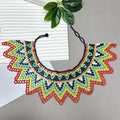 Handcrafted bib or collar necklace made entirely of colorful seed beads. The style is highly artistic and bold, often described as tribal, ethnic, or statement jewelry.